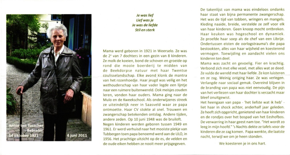 | Busscher, Johanna Gesina | 15-09-1923 | Hezingen | 01-04-2010 | Tubbergen | Nijhuis, Jan | ||||