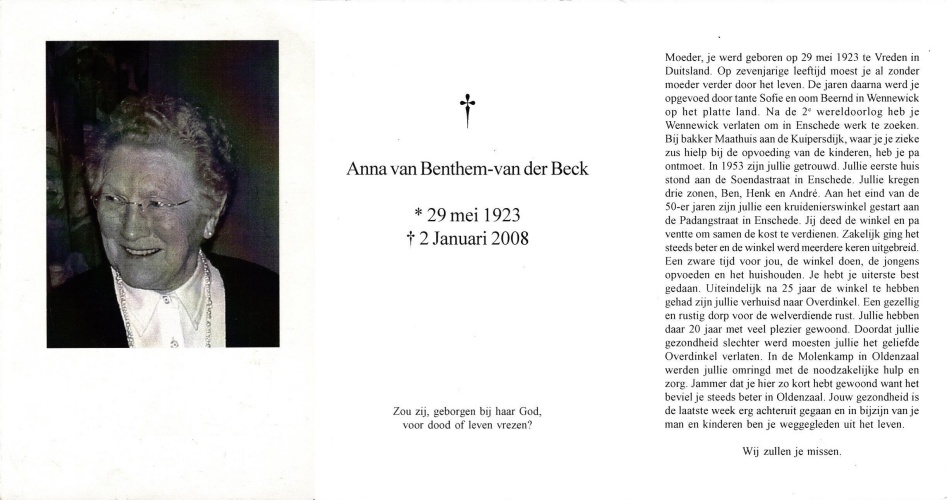 | Bentem van, Rieky | 31-12-1932 | Denekamp | 18-11-2019 | Oldenzaal | |||||