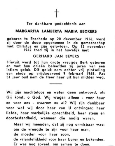 | Boenders, Martinus Johannes | 25-09-1920 | Beckum | 23-11-1979 | Hengelo | Markslag, Maria Johanna | ||||