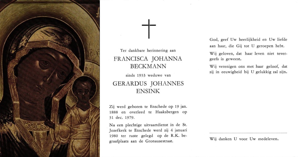 | Blanckenborg | Johanna Gerharda | 16-2-1908 | Eibergen | 5-8-1978 | Almelo | Luttikholt | Franciscus Antonius | ||