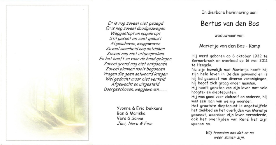 | Bos van den, Bertus | 06-10-1932 | Bornerbroek | 16-05-2011 | Hengelo | Kamp, Marietje | ||||