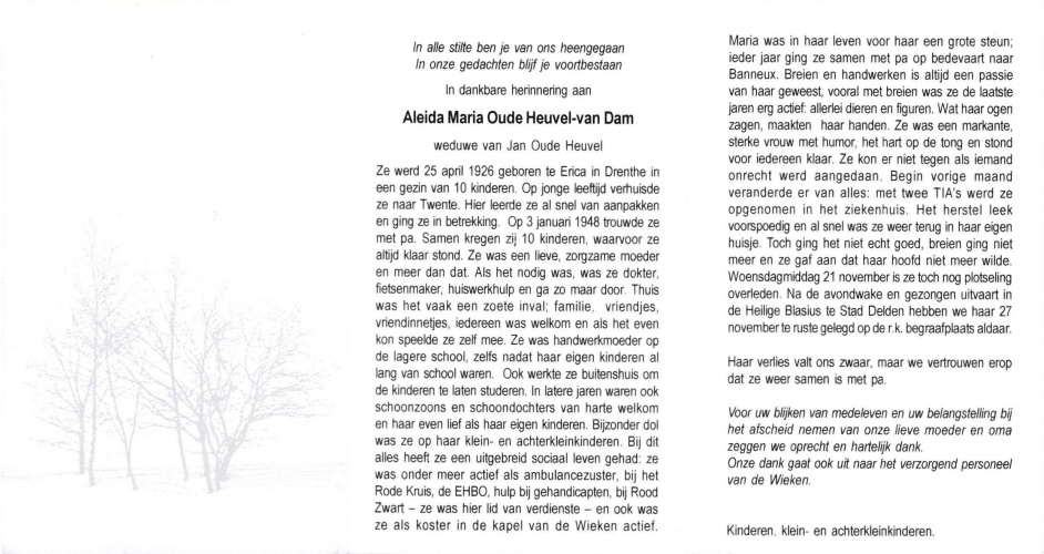 Dam van, Aleida Maria | 25-04-1926 | Erica | 21-11-2012 | Delden | Oude Heuvel, Jan | ||||
