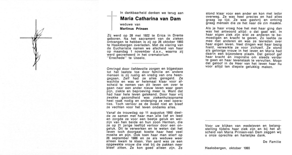 Dam van, Maria Catharina | 28-05-1922 | Erica | 26-10-1993 | Haaksbergen | Prinsen, Martinus | ||||